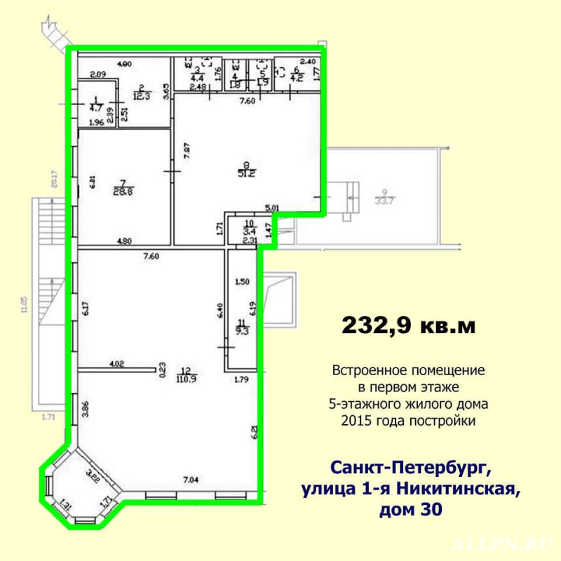 Встроенное помещение 233 кв.м расположено в первом этаже пятиэтажного жилого дома 2015 года постройки на 76 квартир, нежилой фонд, пять комнат, четыре санузла, отдельный вход, окна - на улицу, электричество - 40 кВт, потолки 3.31. Часть комнат подготовлены под чистовую отделку, часть комнат — с чистовой отделкой офисного типа. Отдельный вход - на уровне тротуара без ступенек, наружные двери — металлопластиковые с остеклением. Центральные коммуникации: холодное водоснабжение, водоотведение, теплоснабжение, электроснабжение. Отличная транспортная доступность. Автобусная остановка — пять минут пешком. Метро Пионерская — двадцать пять минут пешком. Возможное использование: офис, дополнительное образование, спорт, сервис, пункт выдачи заказов. Стоимость электроэнергии и водопотребления оплачивается дополнительно по фактическому потреблению.